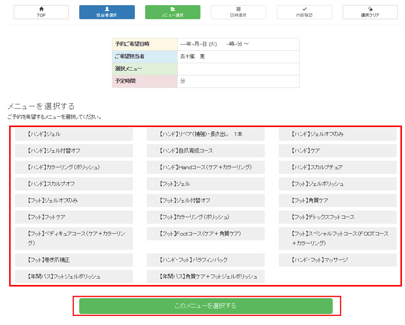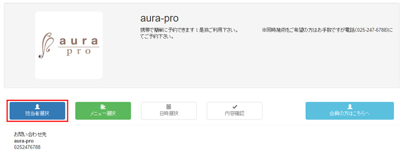 担当者によって施術できるメニューが違いますので、希望のメニューに合わせて担当者をお選びください。