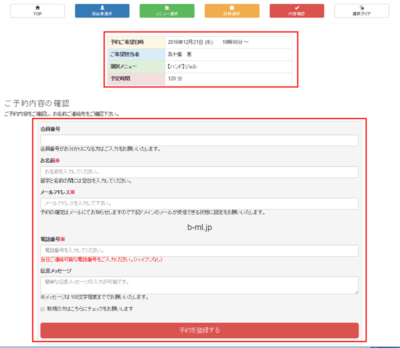 下部フォームにご予約者様のお名前・メールアドレス・電話番号をご入力後、入力内容を確認し、『予約を登録する』をクリックしてください。 -